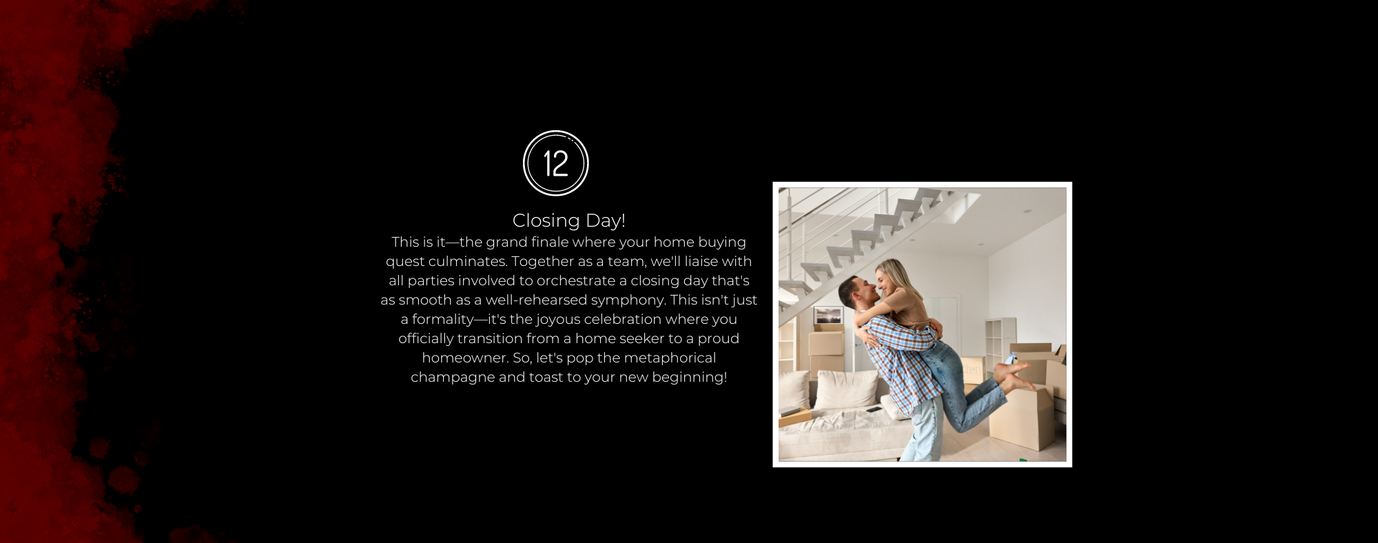 Our seasoned team of real estate superheroes are ready to guide you on this journey with our uniquely designed 12-step home buying extravaganza. Not only are we here to lift the veil on real estate jargon and complexities, but we'll make it a captivating experience that you'll want to rave about at dinner parties!